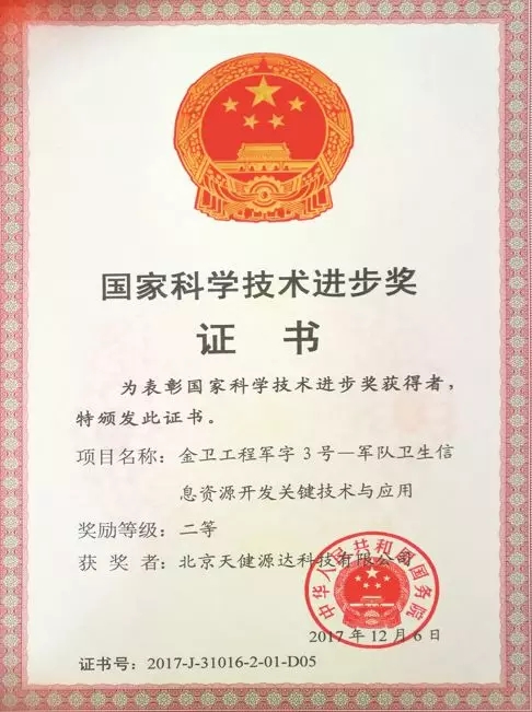 2018年1月8日上午,在中共中央、国务院举行的国家科学技术奖励大会上,我校校友企业北京天健源达科技有限公司“金卫工程军字3号-军队卫生信息资源开发关键技术与应用”获得国家科学技术进步二等奖。党和国家领导人习近平、李克强、张高丽、王沪宁出席大会并为获奖代表颁奖。