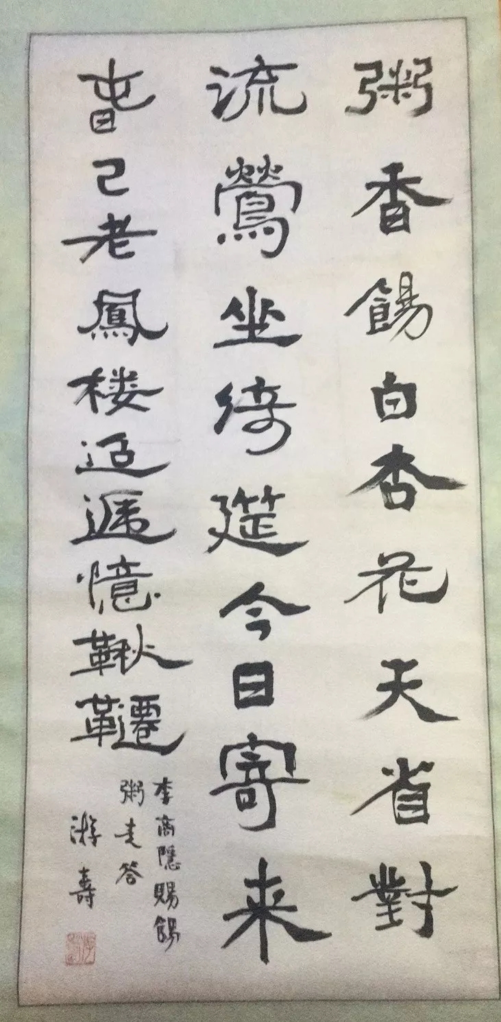 提起游寿老师平易近人,我真是深有感触,我的孩子十几岁的时候,他和游寿老师的孙子两个人接触之后,游寿老师给我家孩子写一幅字,然后又叫我家孩子给他孙子写一幅字,孩子们因为游寿老师人好也非常愿意与她相处。