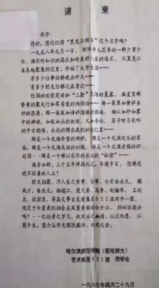 11月1日,我校艺术学院老校友徐玉璞先生及夫人杨淑琴女士返回母校,两位老人接受了校友办工作人员的采访。看到校友办的工作人员,两位老人非常激动,徐玉璞先生饱含深情地亲吻了校友总会赠送的校徽,谈及大学时期师友间的往事,八十一岁高龄的徐玉璞先生更是激动得热泪盈眶。徐先生有做笔记的习惯,他随身携带着一个翻旧了的笔记本,上面记录着他哪天参加了什么活动,自己有什么样的感悟。在笔记本的折页里还夹着他毕业多年后收到的同学聚会邀请函。访谈开始前,我有幸拜读了这份情深意浓、画面感十足的邀请函。
