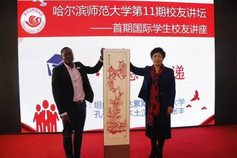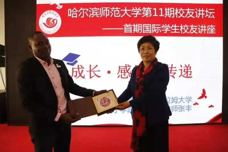 11月11日下午,第11期校友讲坛暨首期国际学生校友讲座在江南校区留学生三公寓多功能厅成功举办。本次讲坛主讲嘉宾是2015级坦桑尼亚籍优秀校友张丰(Emmanuel Richard Legonga)先生,主题为“成长▪感恩▪传递”。臧淑英副校长在讲坛正式开始前接见了张丰校友,对他跨越万里再次回到母校表示诚挚的欢迎,对他获得的成就表示由衷的祝贺,认为他的讲座将是对母校的最好宣传,也将为全体留学生校友起到示范和引领作用。臧淑英代表母校向张丰先生赠送了学校师生的剪纸和剪刻作品并亲手为他佩戴了校徽和校友纪念徽章。